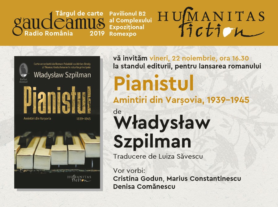In perioada 22-24 noiembrie, la târgul de carte Gaudeamus 2019, are loc lansarea cărții „Pianistul” al cărei autor este pianistul și compozitorul polonez Władysław Szpliman. Traducere realizată de Luiza Săvescu.